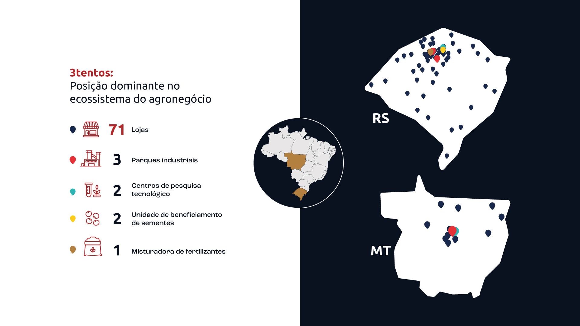 Atuando em 72 lojas, 3 parques industriais, 2 centros de pesquisa tecnológicos, 2 unidades de beneficiamento de sementes e uma unidade misturadora de fertilizantes, a 3tentos consolida a cada dia sua operação na cadeia de valor agrícola no Rio Grande do Sul e Mato Grosso.
